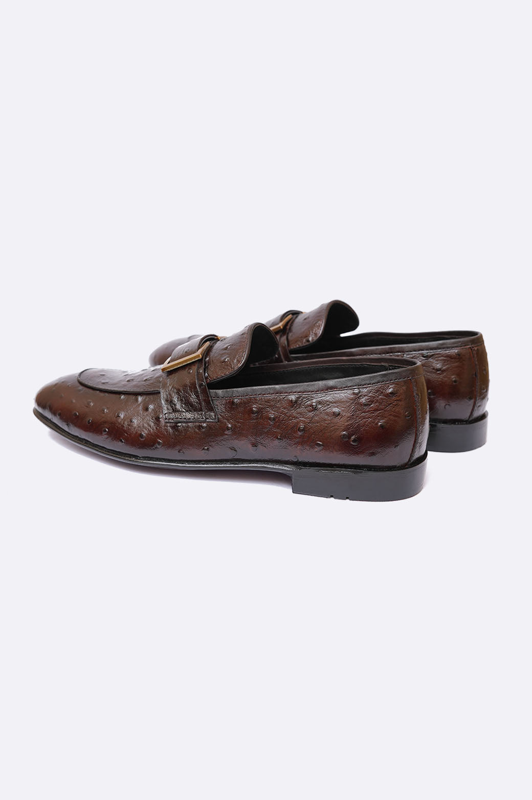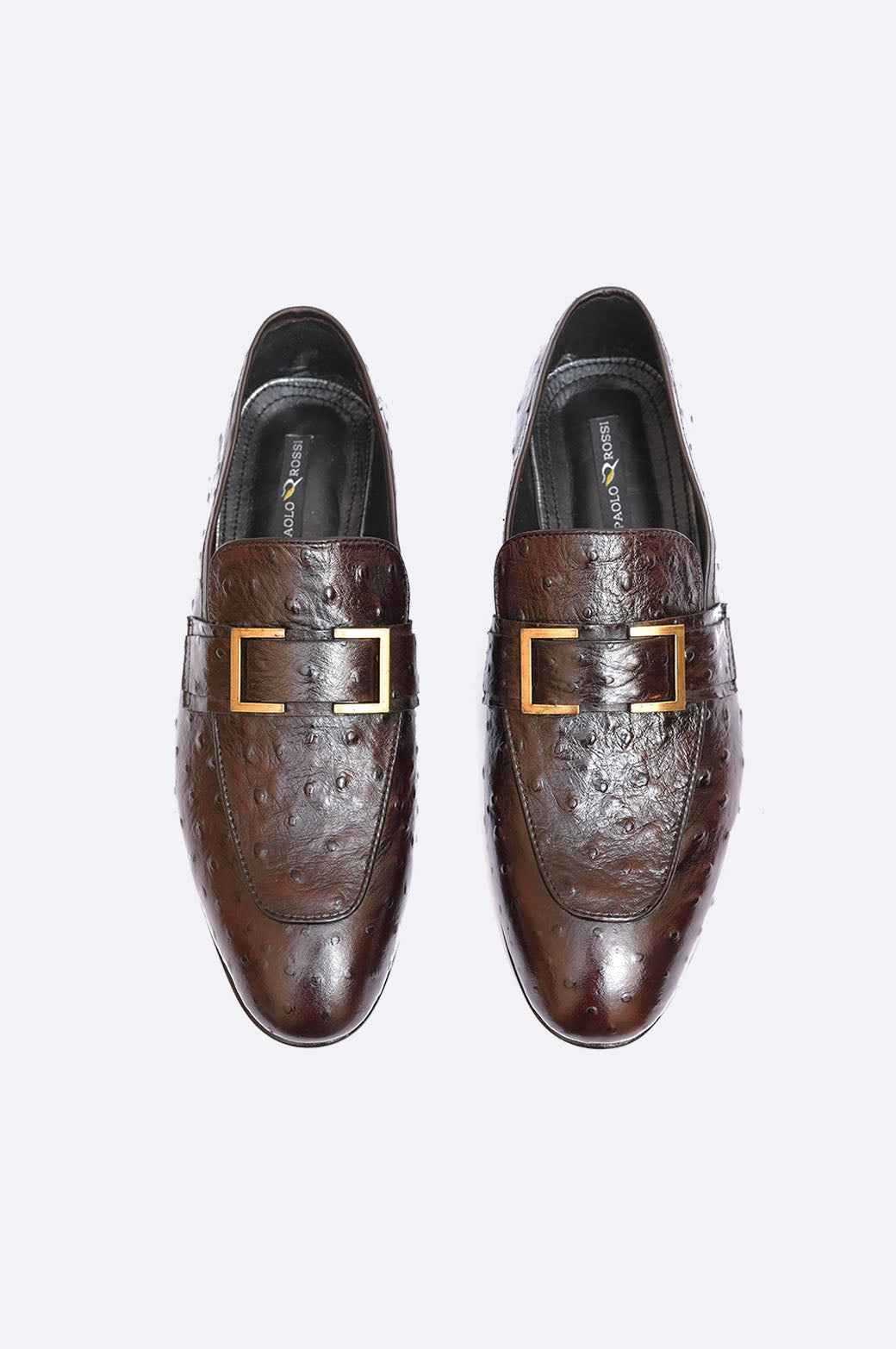 Turn heads with Paolo Rossi’s Brown Ostrich-Embossed Leather Loafers, designed for men who own their presence. The exotic ostrich texture delivers standout sophistication, while the polished gold buckle adds a confident, luxury edge.