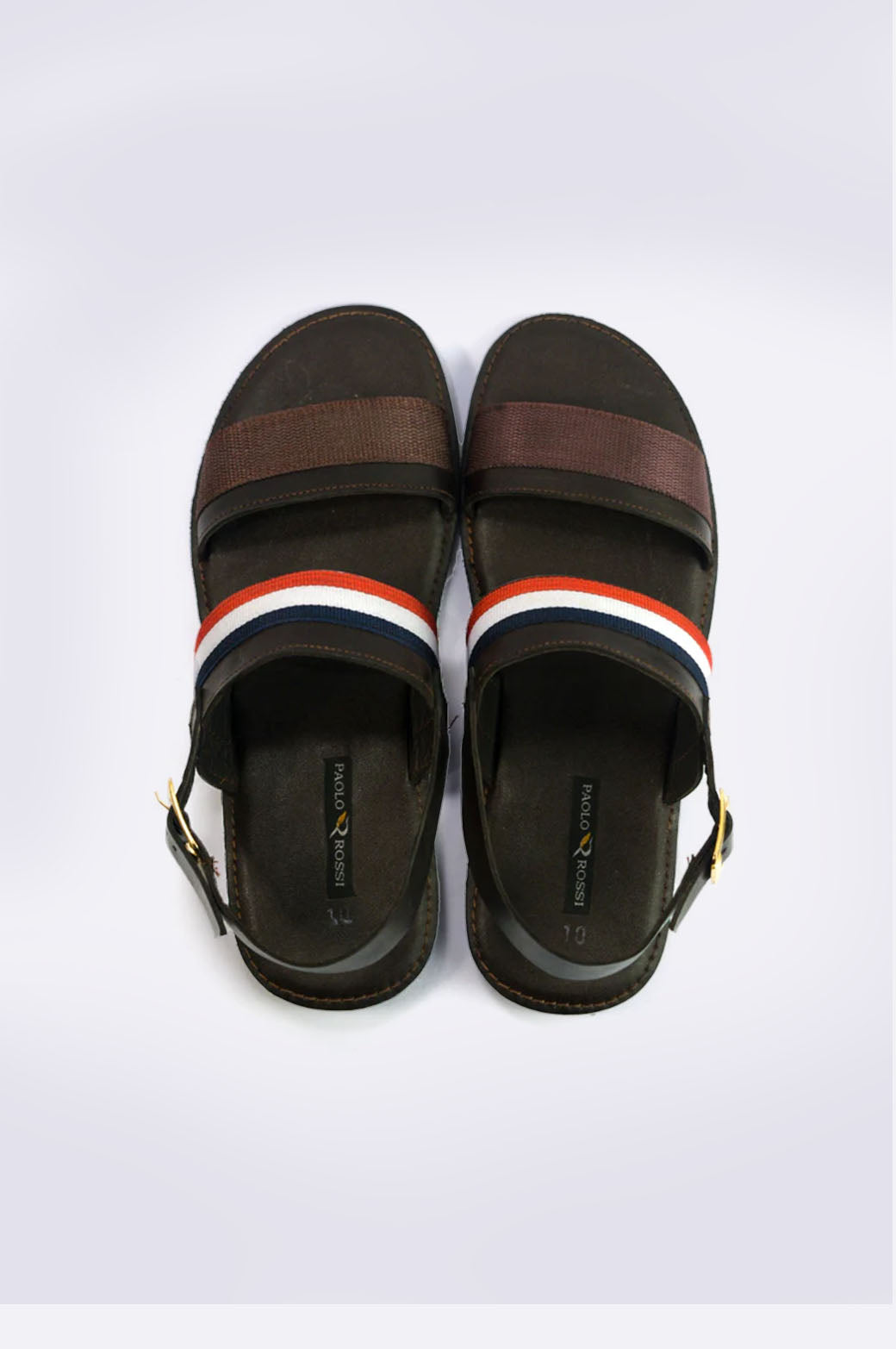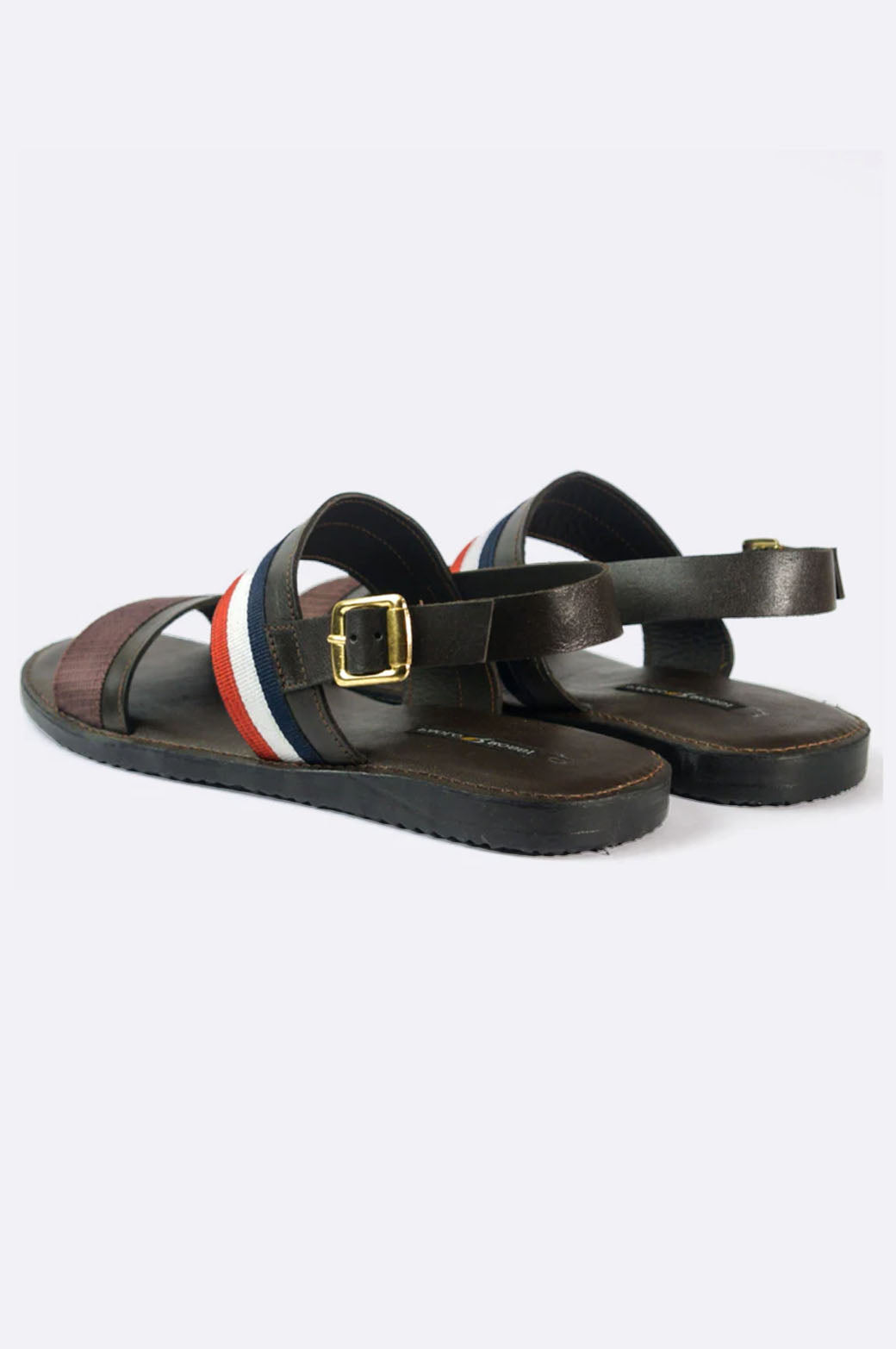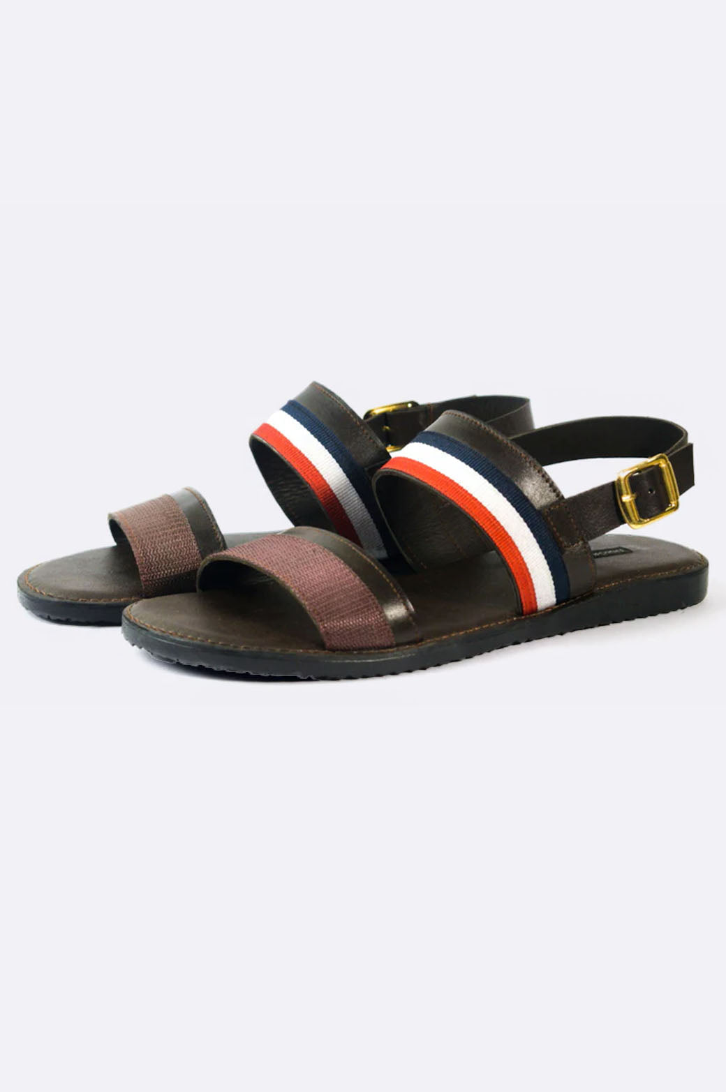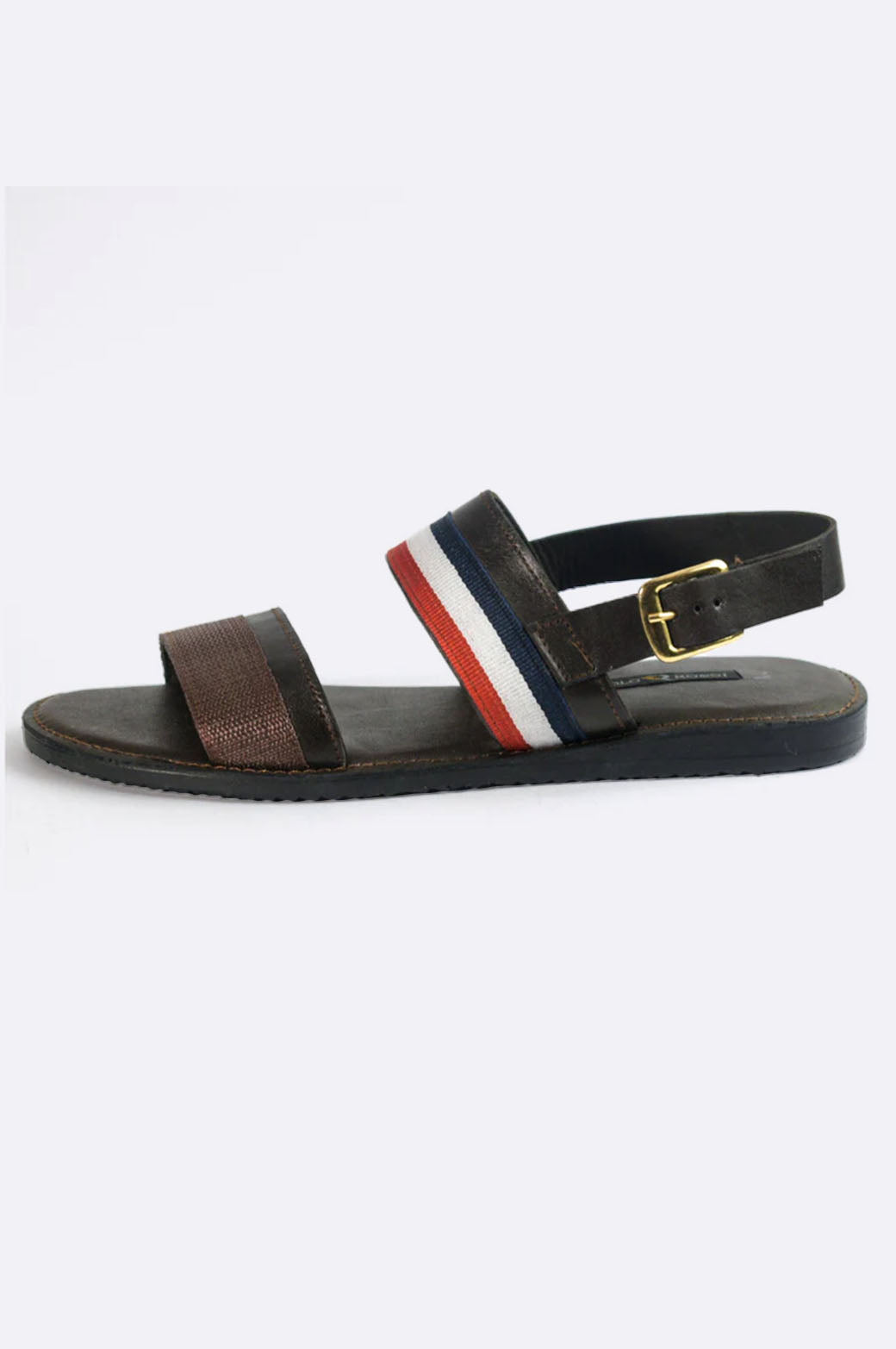 Make a bold move with the Paolo Rossi Striped Leather Sandals — where comfort meets contemporary flair. These handmade sandals feature durable brown leather paired with a dynamic red, white, and navy fabric strap. The gold-tone buckle adds a premium finish, while the cushioned sole ensures you're ready for whatever the day throws your way.