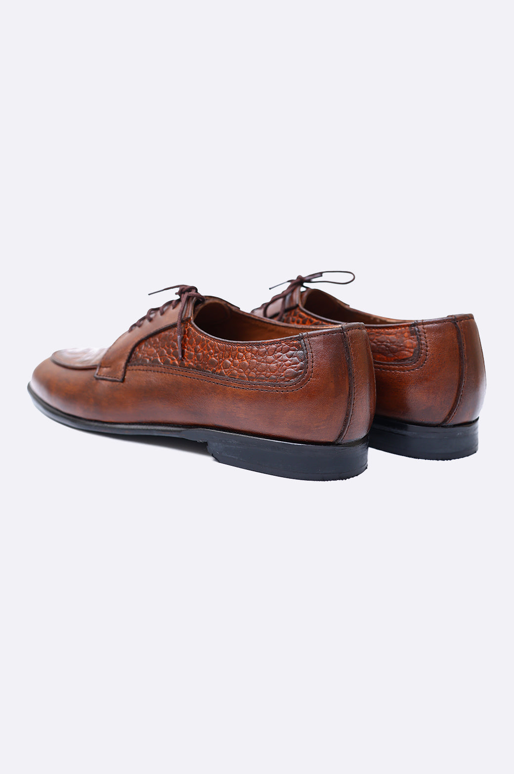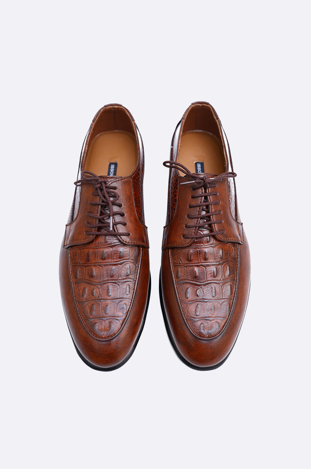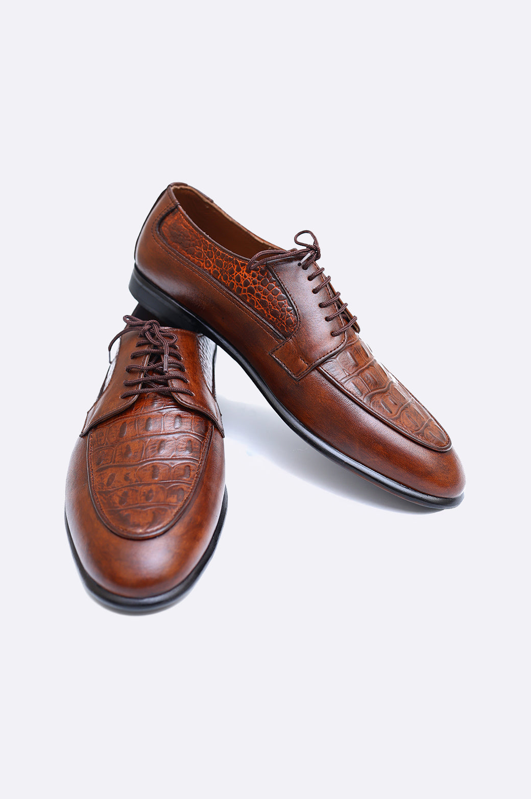 Handmade using premium full-grain leather, this design features a rich brown patina complemented by an embossed texture that adds depth and character without overpowering the silhouette. The sleek lace-up profile ensures a tailored fit, while the carefully engineered arch-support insole provides superior balance and all-day comfort—making it ideal even for extended wear and orthopedic needs.